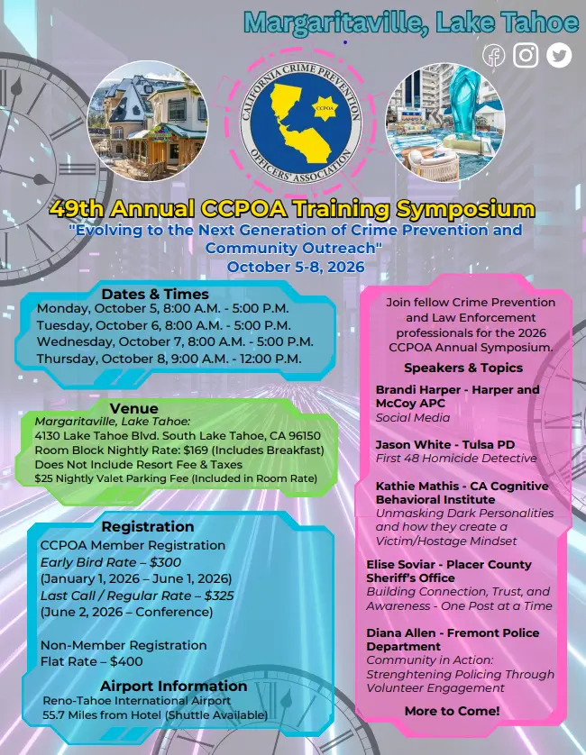 The 49th Annual Training Symposium of the California Crime Prevention Officers’ Association (CCPOA) will be held October 5-8, 2026, at Margaritaville in South Lake Tahoe.