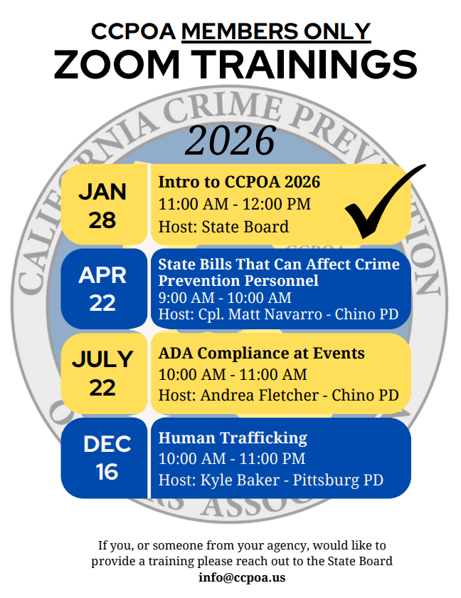 CCPOA is committed to providing its members with the latest crime prevention information, resources, tools and techniques in the prevention industry to assist professionals in the performance of their duties and to establish a consistency in the dissemination of information to the public by crime prevention and other professionals.